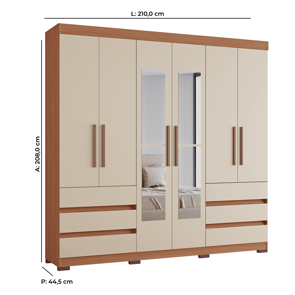 | Apresentamos o Roupeiro Panamá da Tuboarte Móveis. 100% MDF, contém 06 (seis) gavetas espaçosas com corrediças telescópicas para um deslizamento suave, cabideiros em alumínio e uma divisão interna ampla e bem dividida, com espaço para ele e ela. Acompanhado por 04 (quatro) espelhos inclusos. |